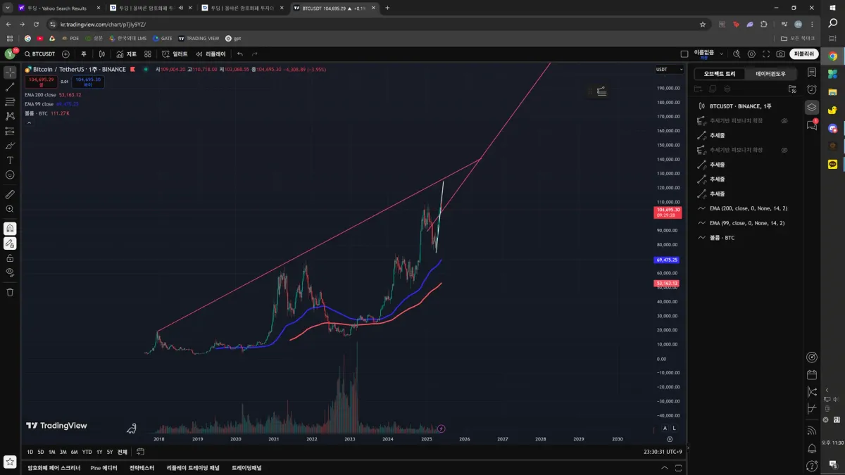 3번 사진의 가장 긴 붉은 선은 비트코인 상승세의 전체적인 고점을 이어봤습니다. 이를 토대로 이번 상승 싸이클의 고점을 130 - 140 근처로 예상하며