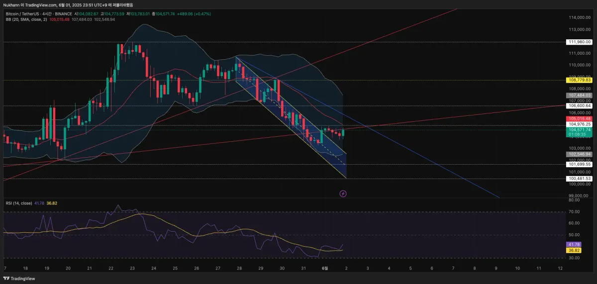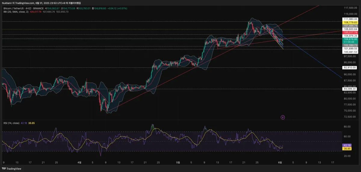 현재 비트코인 4시간봉 차트에서 채널 상방돌파 후 횡보중으로 보여지며, 이 횡보가 105k라인을 돌파해 주고 파란색 하락 추세선을 돌파해준다면 롱포지션을,