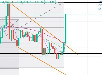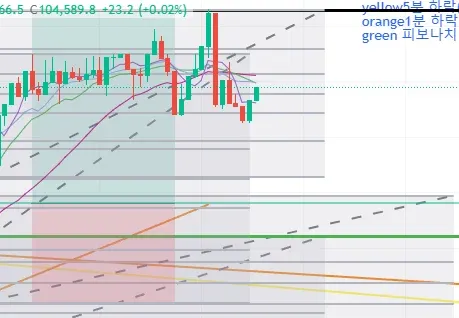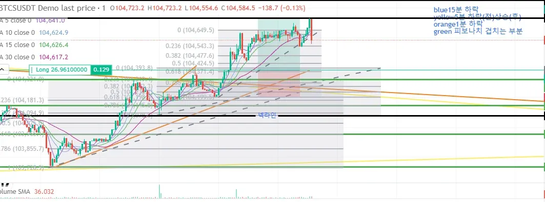 이후 5분봉과 1분봉에서 그은 추세선을 1차 상방 이탈 하였을때 리터치 할때까지 기다려 보자 하였고, 리터치 하며 상방이탈하면서 피보나치들이 모여 만들어둔 지지&저항선도 함께 넘어서 진입을 시도하였습니다. 진입 이후 손절라인은 피보나치 저항선을 기준으로 잡았으며, 익절구간은 5분봉에서 그어둔 저항선에 맞추었습니다.