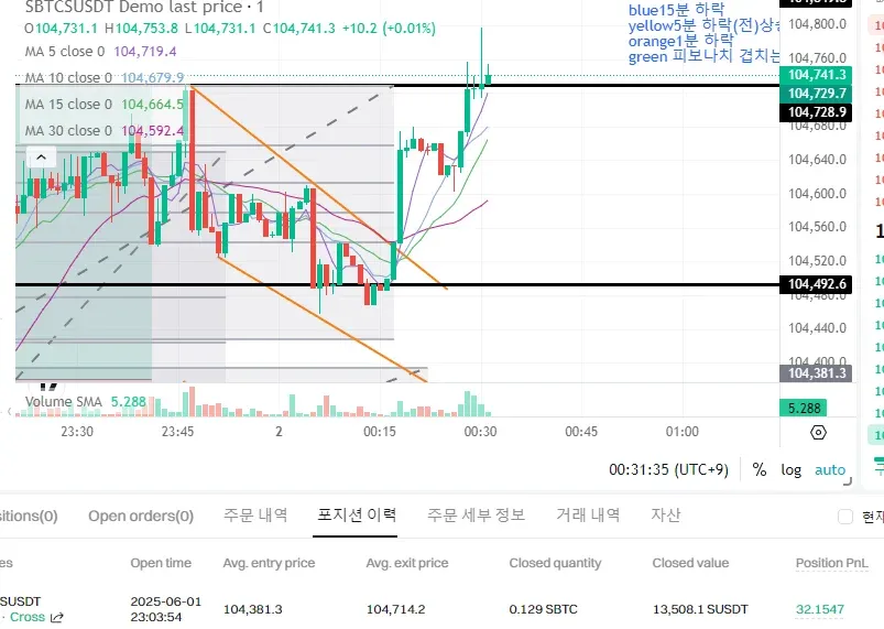 올려주신 15초 영상을 참고하여 모의 트레이딩을 진행하였습니다. 모의 트레이딩에는 15초가 없어 1분봉으로 진행하였습니다.