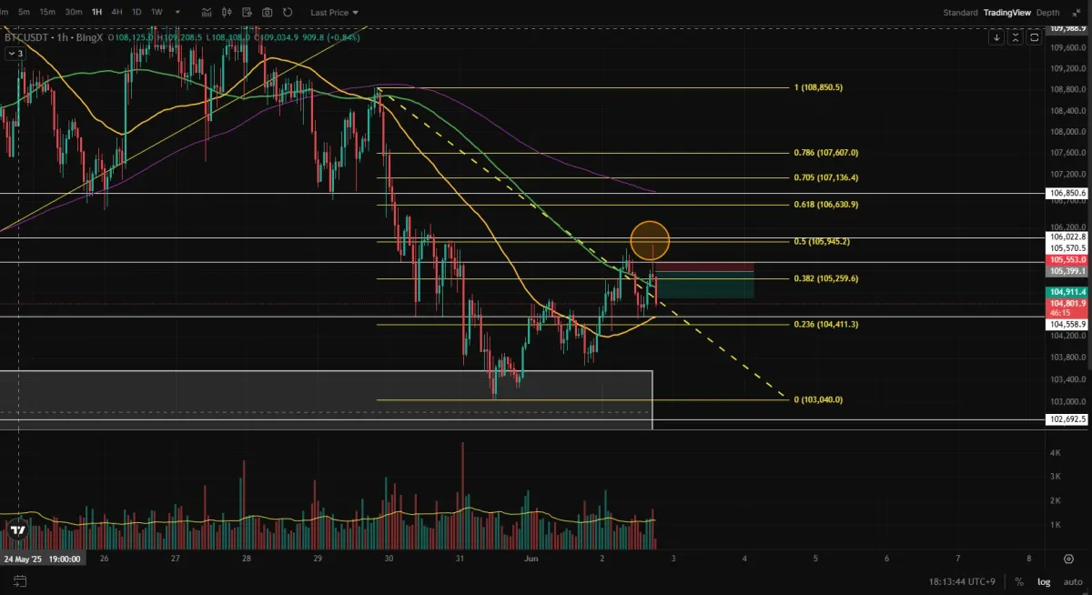 1시간 하락시작점에서 그은 하락추세 피보나치 되돌림의 0.5구간 근접후 하락으로의 강한 가격반응.