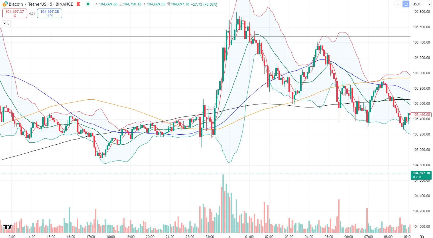 200이평선과 좁은 볼린저밴드 상단에 맞는걸 근거로 밑의 매물대까지 하락할 것으로 예상했으나 조금 내렸으나 결국에 큰 상승이 나와 손절 진행함.