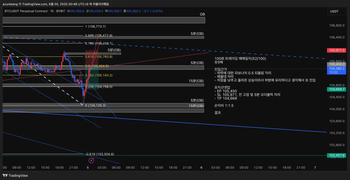 - SL 105,971, 전 고점 및 5분 오더블럭 자리