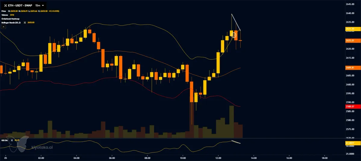 이더리움이 급등을 했다가 rsi가 꺽이고 볼린저밴드 위에 캔들이 있어서 숏을 쳤습니다.