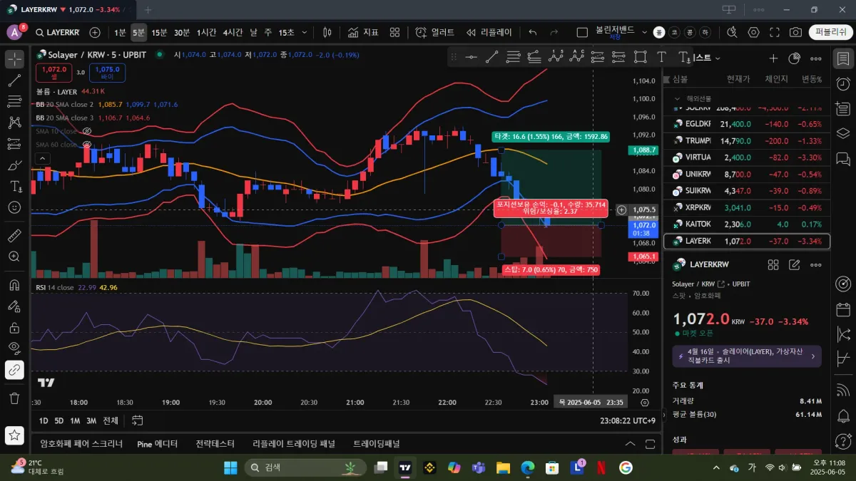 볼린저 밴드 하단선에서 rsi 30 이하로 과매도 상태와 1072에서 지지를 받는 모습을 확인 했지만 더 하락하여 손절 너무 급하게 진입 했습니다 더욱 더 확인하고 천천히 진입 하겠습니다