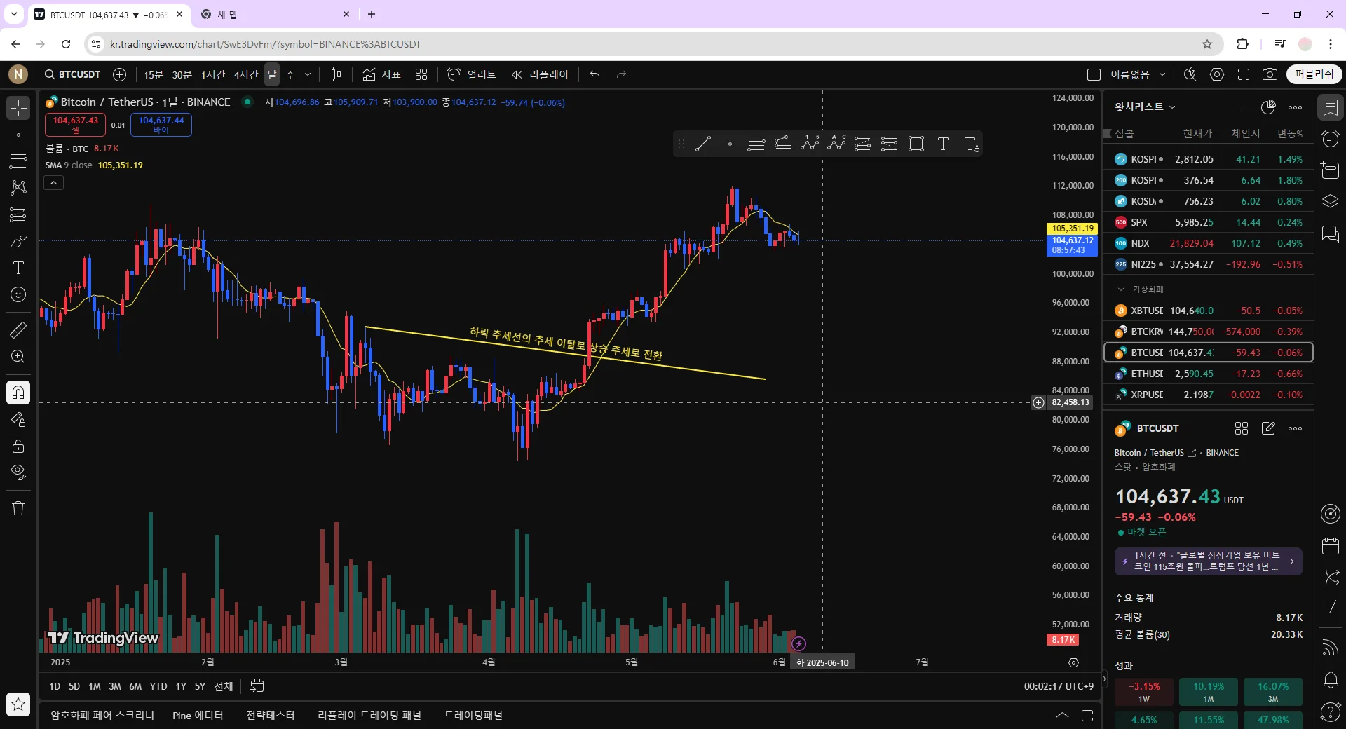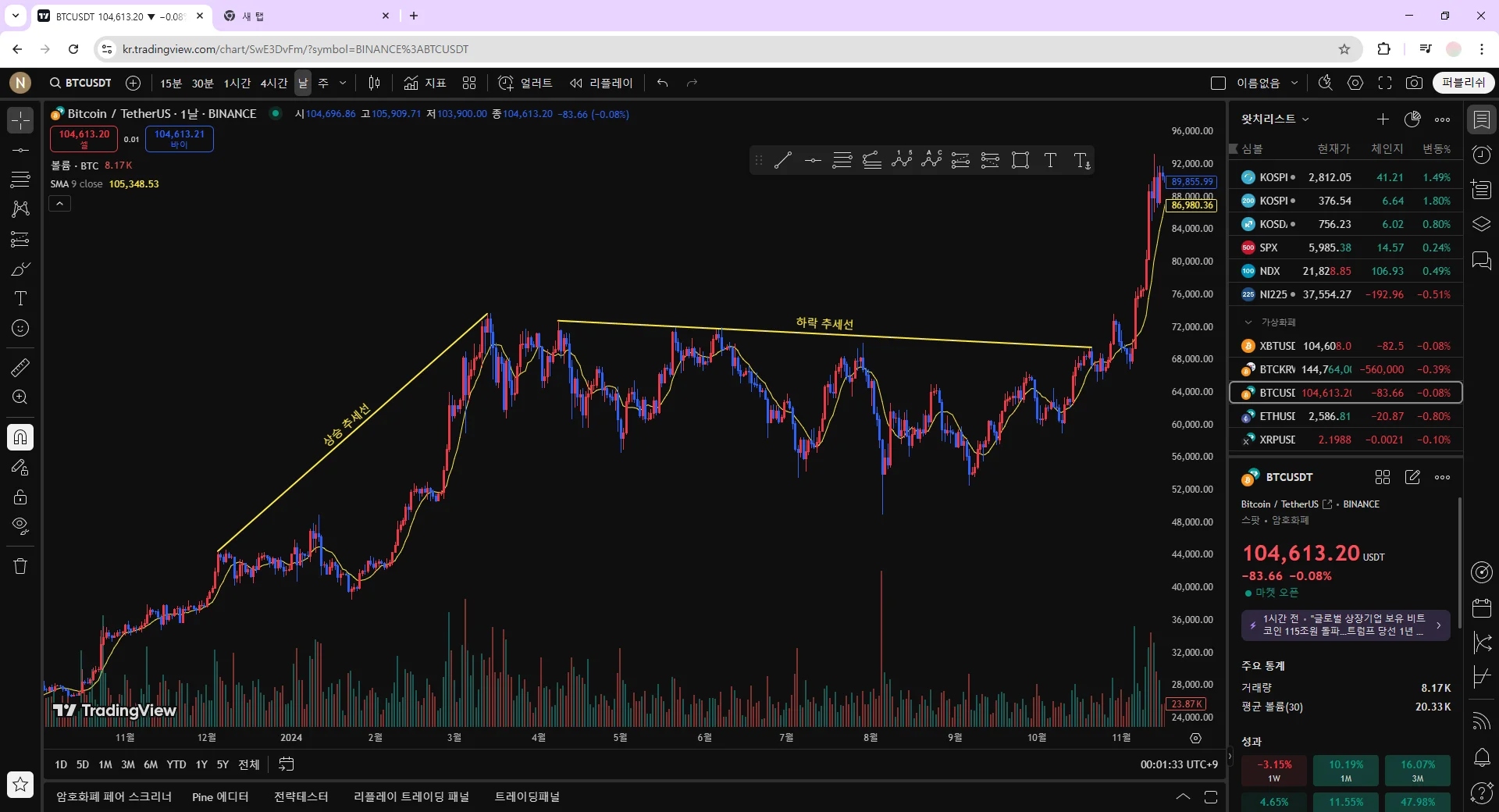 오늘 배운 내용을 바탕으로 상승/하락 추세, 저항선과 지지선의 박스 형태, 추세 이탈, 저항과 지지선 돌파 지점을 BTCUSDT 일봉 차트에서 찾아서 캡쳐해 보았습니다!