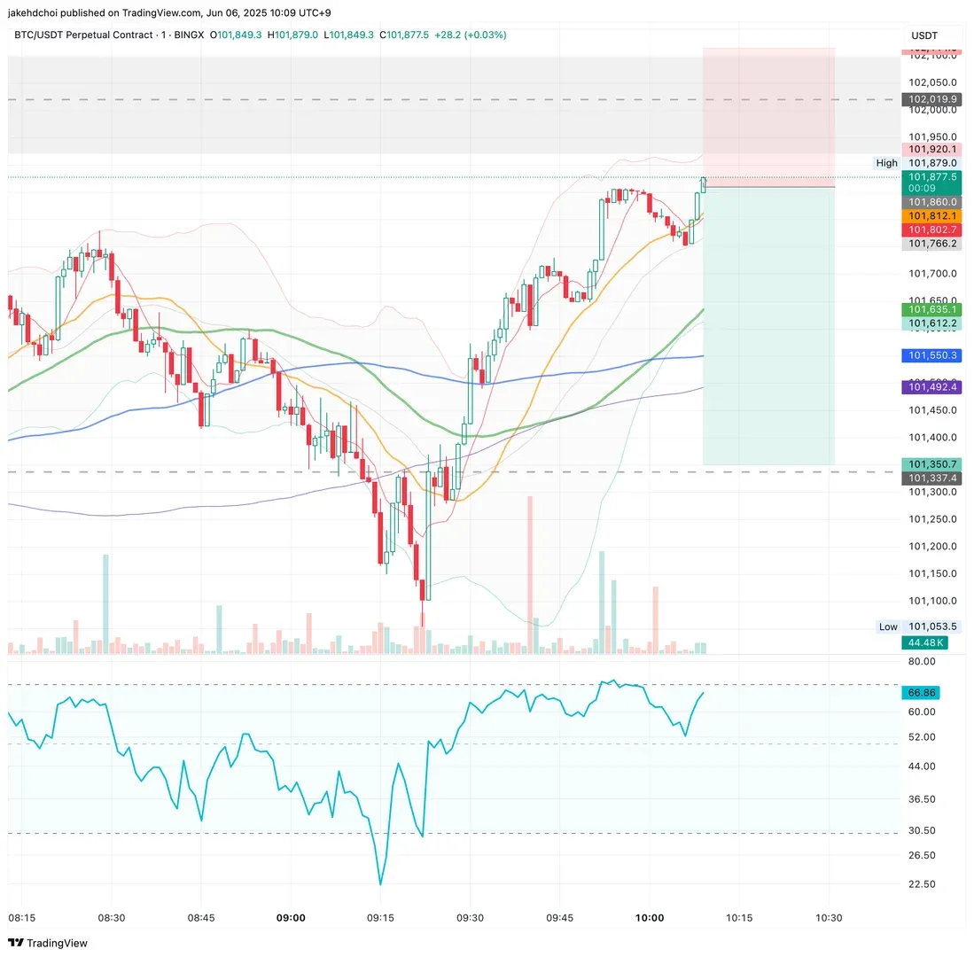 - 한번 돌파 당했지만 이전 저점의 가격 반등 지점(102k)