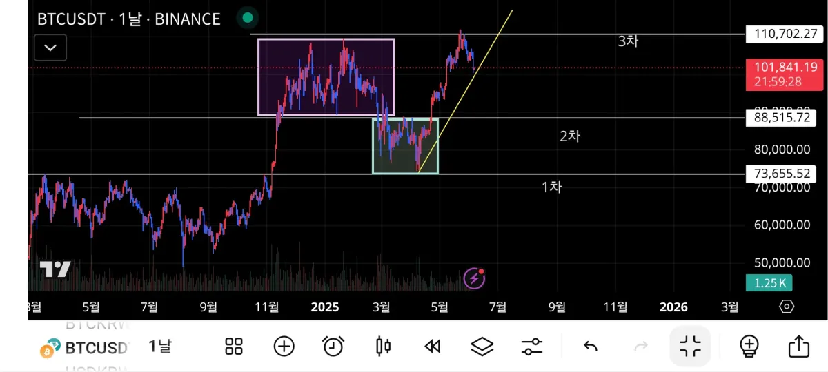 11월 말까지 이어지던 저항선이 25년 4월쯤 지지지선으로 작용한것을 1차 수평선으로 작도하였습니다.