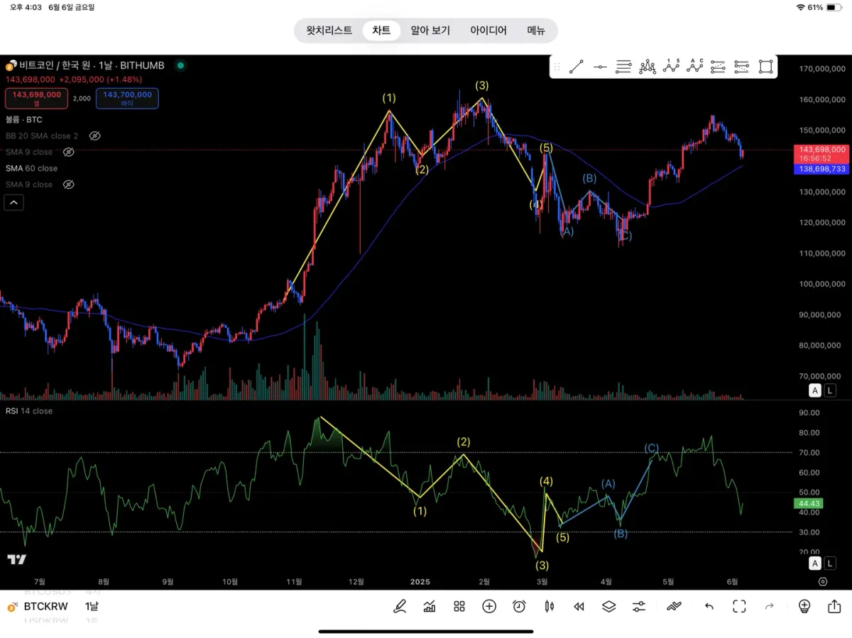 노란색 부분: 주가는 올라가는데 rsi는 내려감 상승 다바이전스 포착