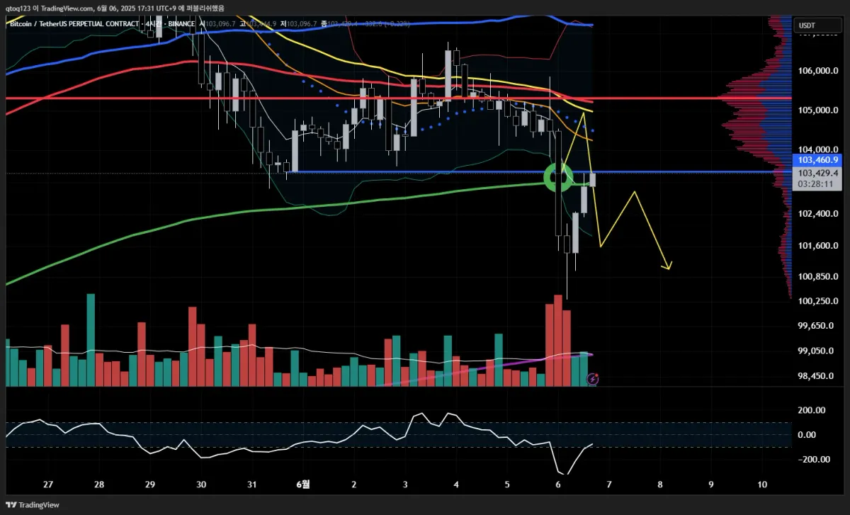단기 지지 및 큰 이평선 지나가는 부분 + 볼린저밴드 하단 + CCI 과매도 구간이여서