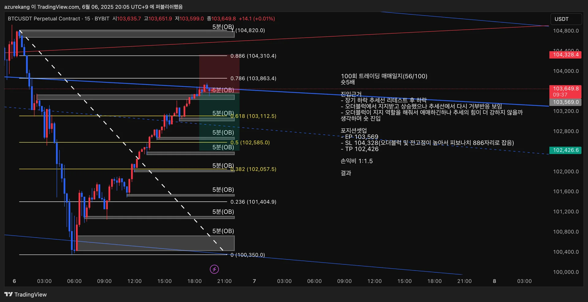 - SL 104,328(오더블럭 및 전고점이 높아서 피보나치 886자리로 잡음)