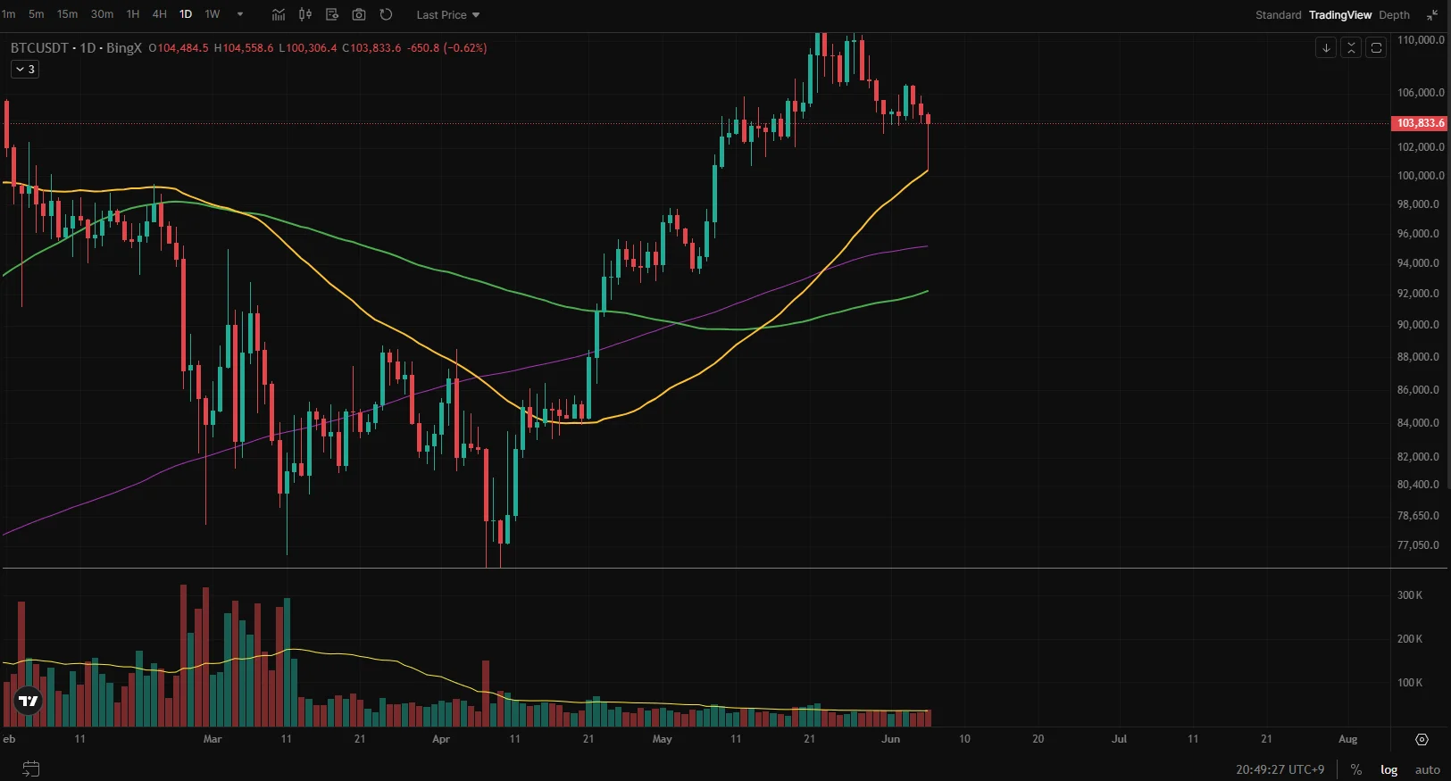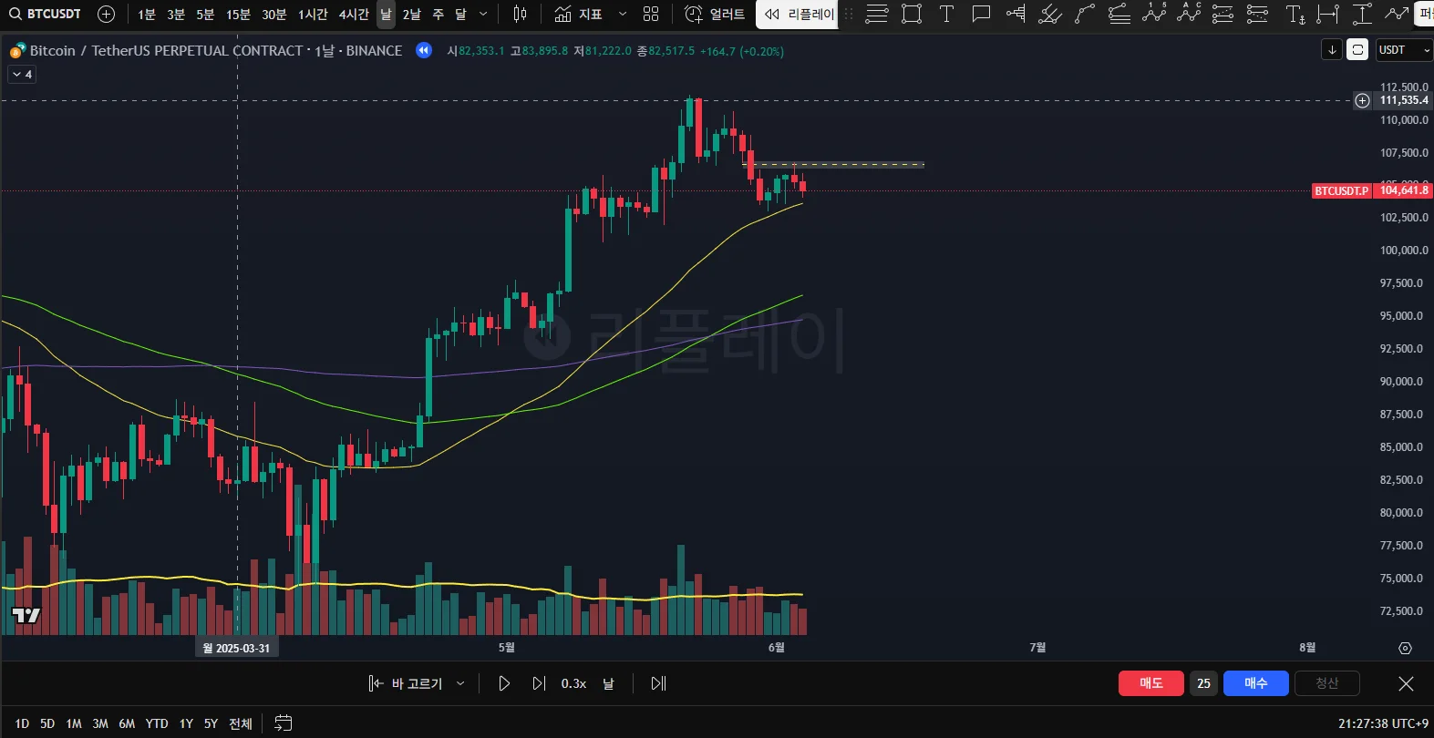 일봉에서 길고긴 상승추세선을 그렸던 상승추세가, 5월 28일날 하락돌파되었고, (나는 이때 비트코인은 어쩌면 하락세, 아니면 조정세에 들어갔다고 판단했다)
