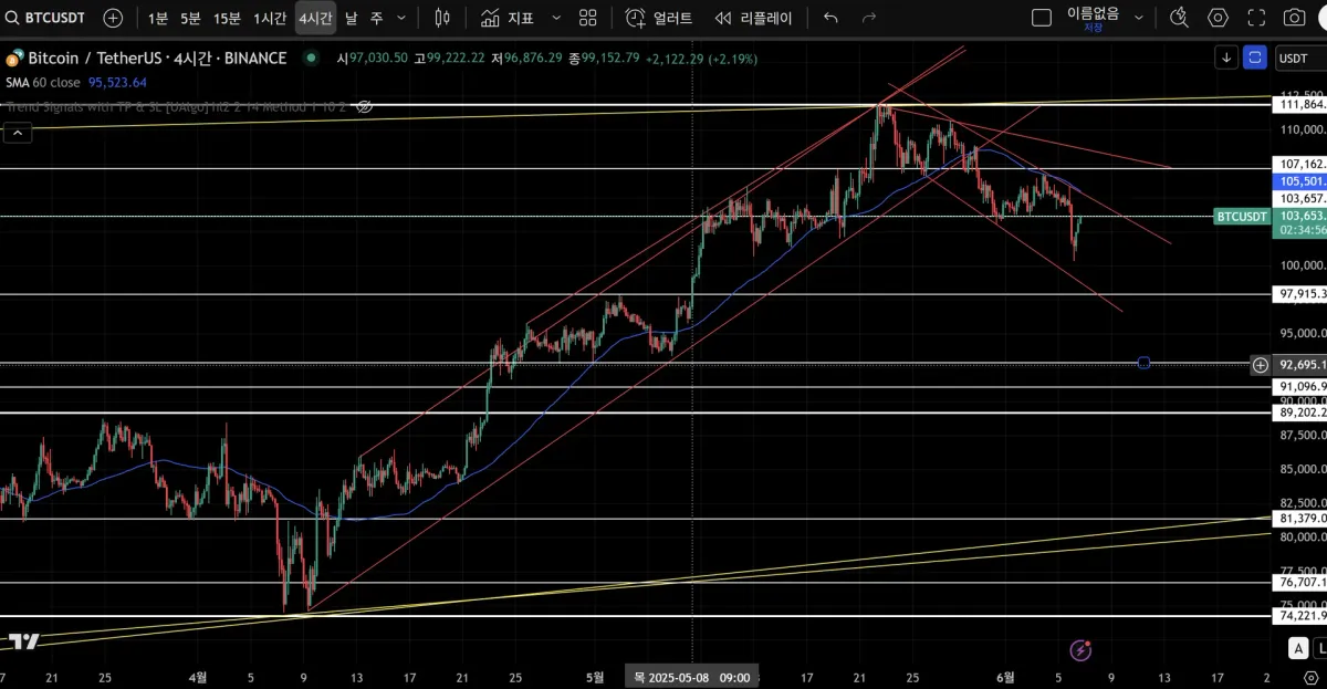 4시간봉 차트의 지지와 추세선입니다.