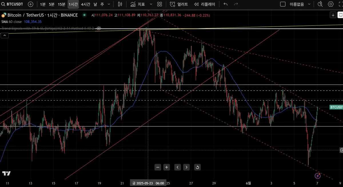 1시간봉 지지와 추세선 입니다.ㅓ