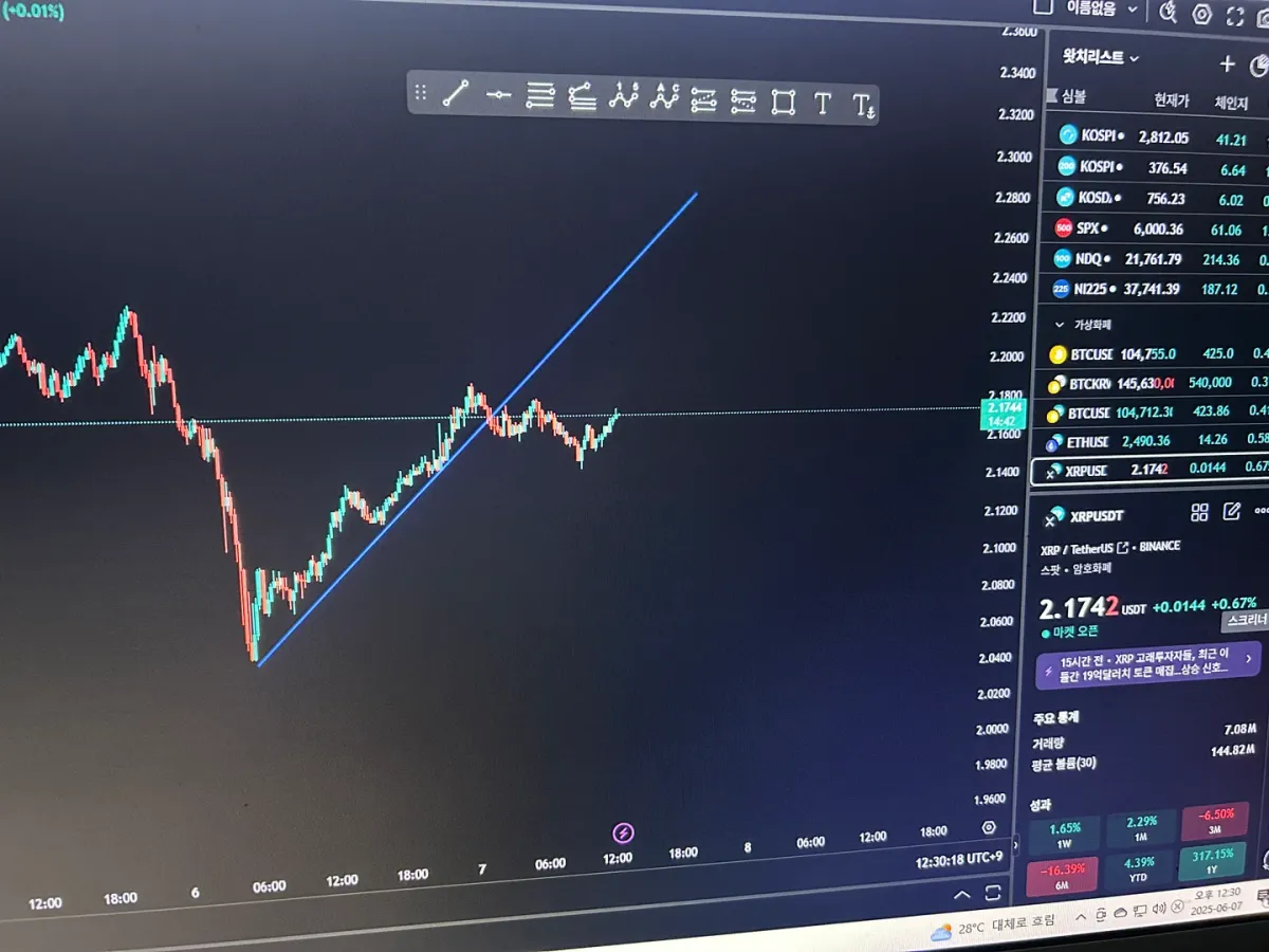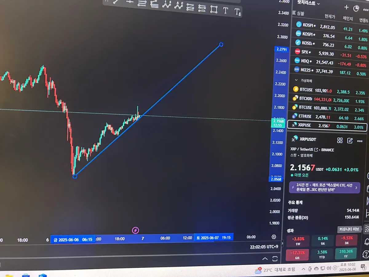 작도 근거로는 15분봉 상승 다이버전스가 발생한 지점이고 2터치 추세선으로써 앞으로의 지지를 검증해볼 필요가 있다고 판단했기에 작도했습니다.