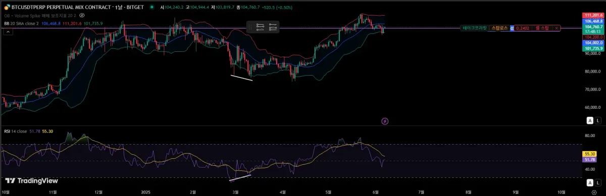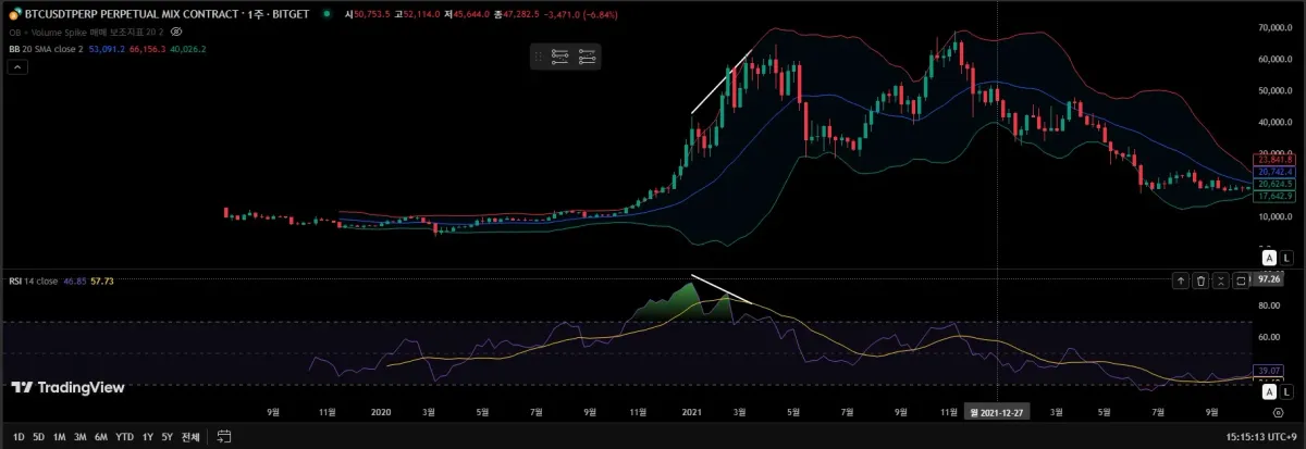 고점은 높아지고 있고 RSI 상대 강도 지수는 낮아지는 하락 다이버전스로 볼수있겠습니다.