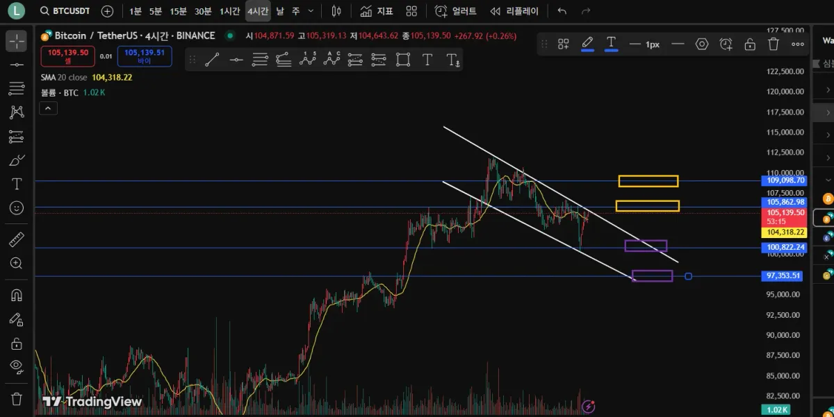 또한 노란색 박스선은 저항선으로 1차 저항선구간과 하락추세선이 근접해 있기에 아무래도 지지선인 보라색 박스선구간인 1차 지지선 약100,220불 부근까지 내려올것같다고