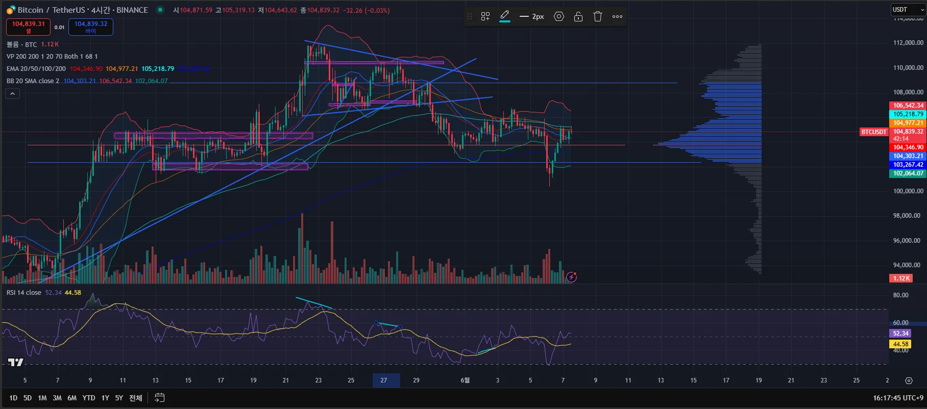 비트코인 4시간 봉입니다! 표시해둔 부분이 각각 상승과 하락 다이버전스가 발생했다고 생각합니다.