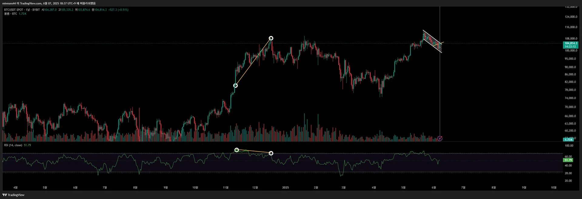 가격이 상승하는 반면, RSI는 감소하는 하락 다이버전스를 확인했습니다.