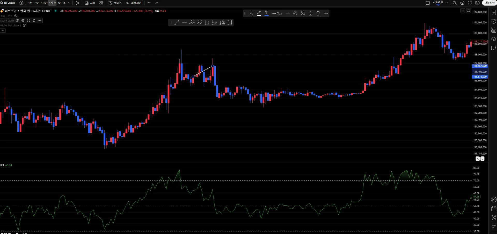 비트코인 1시간봉입니다. 강의 영상으로는 이해가 좀 되어서 쉬울 줄 알았는데, 막상 작도를 해보려 하니 정말 어렵더라구요.. 이게 맞는지 잘 모르겠습니다. 공부를 더 열심히 해보겠습니다.