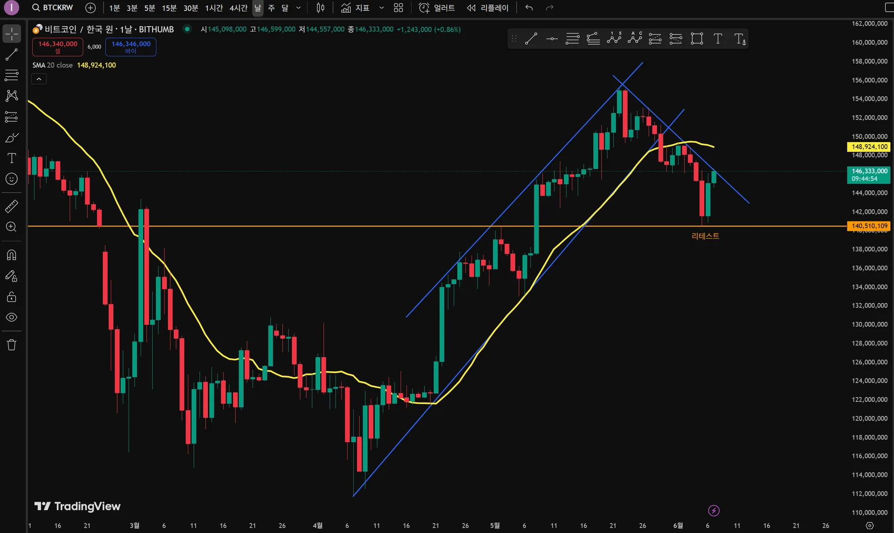 비트코인 일봉 차트에 지지 저항 작성했습니다.