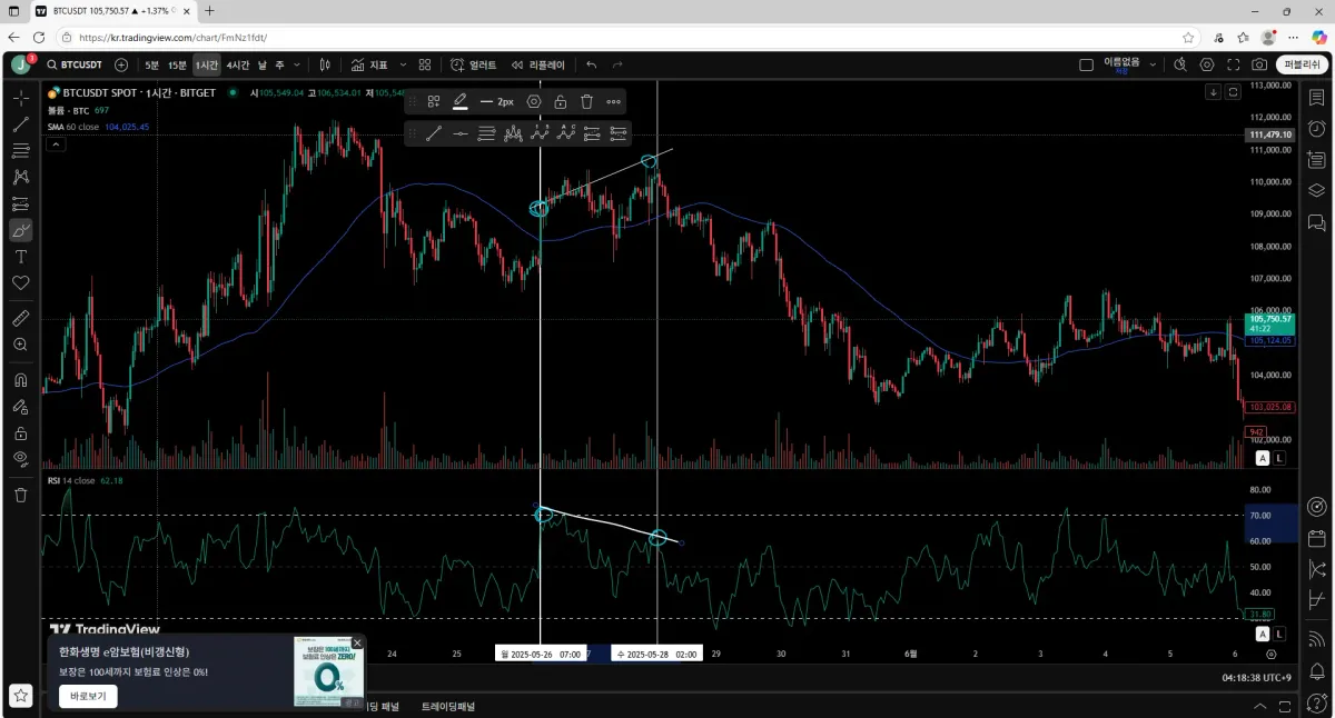 1시간 봉으로 보는 하락 다이버전스구간 입니다