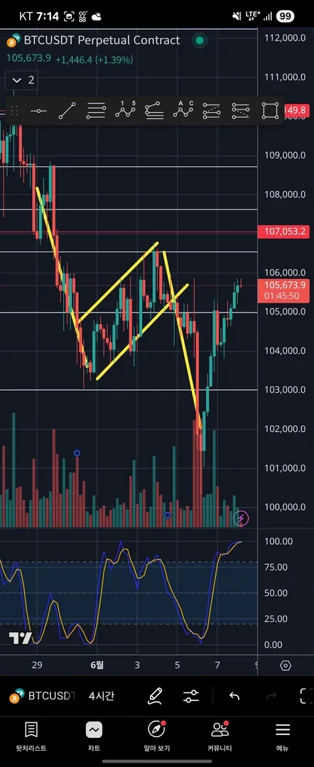 비트코인 4시간 봉에서 베어 플래그 패턴을 확인하고, stoch RSI 및 지지 저항을 확인하여 플래그 상단 지지에서 숏 진입하였고, 이전 저점 저항을 익절 구간으로 설정하였습니다.