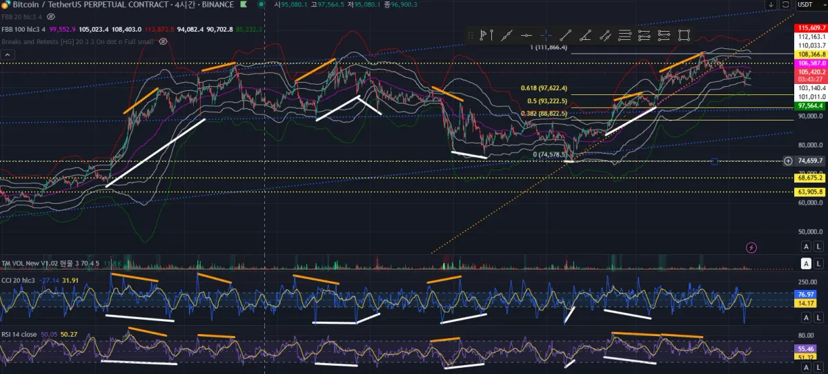 작성자CCI를 자주 쓰다보니 함께 그렸습니다. 동시에 보니 차이가 나는 구간이 많이 있네요. 흰색이 상승 다이버전스, 주황색이 하락 다이버전스, 중간에 히든도 하나 있습니다.