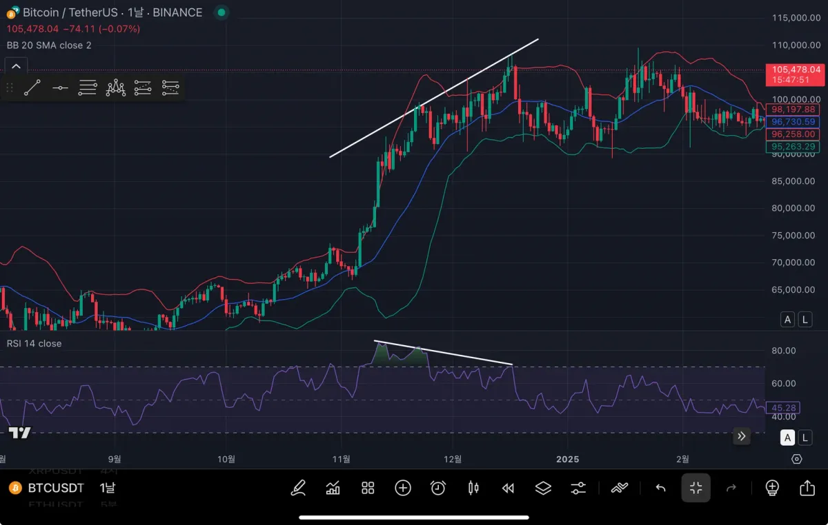 고점을 계속해 갱신하지만 rsi값의 고점은 낮아지며 하락 다이버전스가 발생함을 알 수 있습니다.