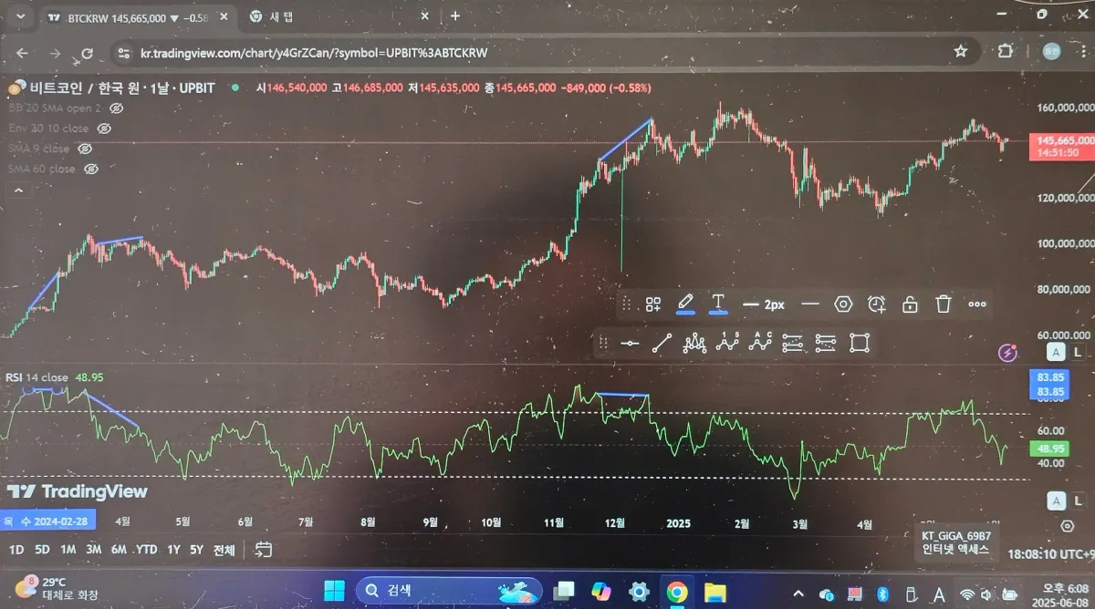 다이버전스를 찾는다고 파란선을 그어봤는데 눈으로 기울기를 보고있으면서도 긴가민가 합니다. 더 익숙해지겠습니다