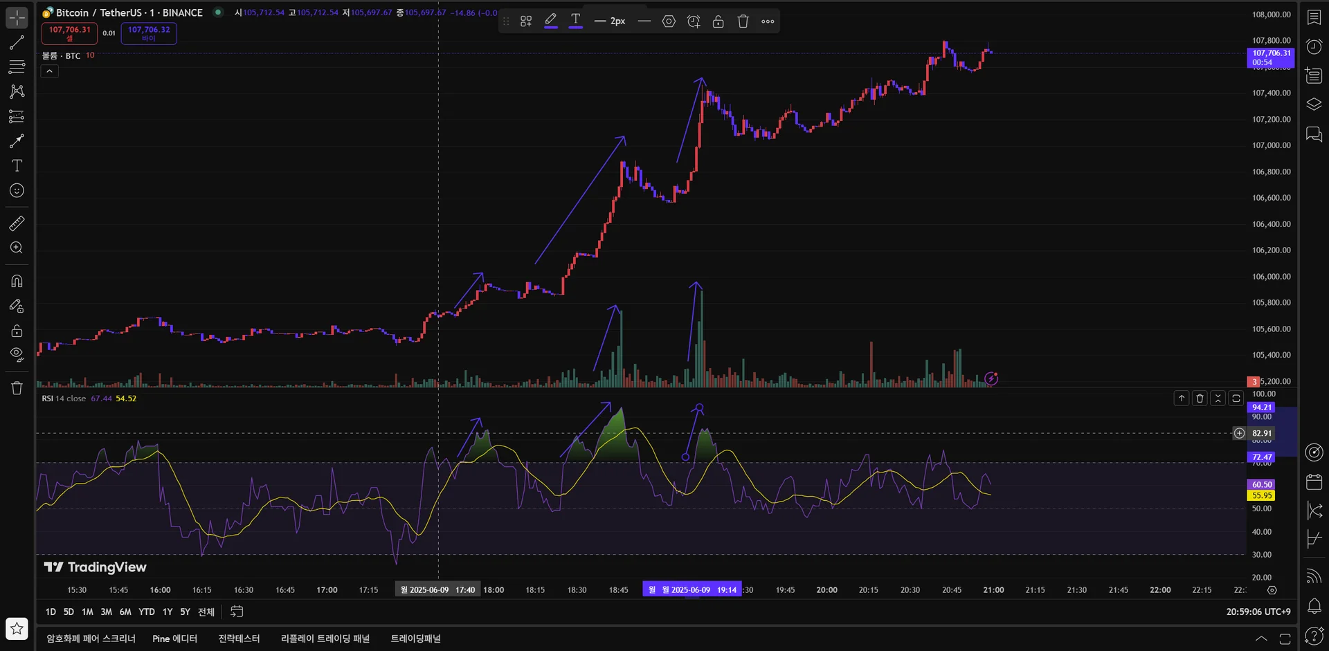 RSI 지표 추가 후 상승 시 거래량과 상승/하락세 확인