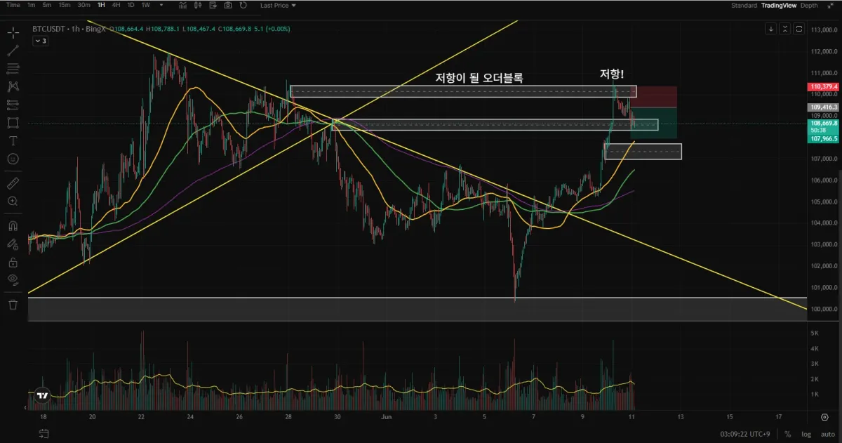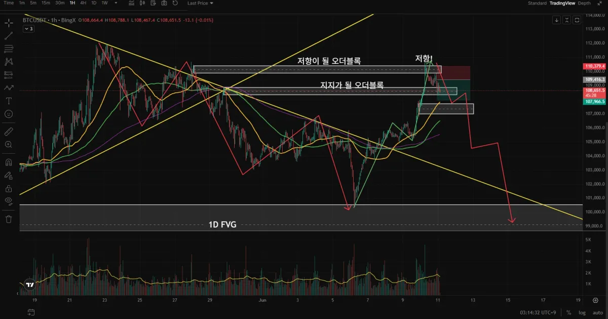 상승을 거듭한 비트코인이 내가 저항이 되리라 예상한 오더블록에 닿고 하락을 시작했기에,