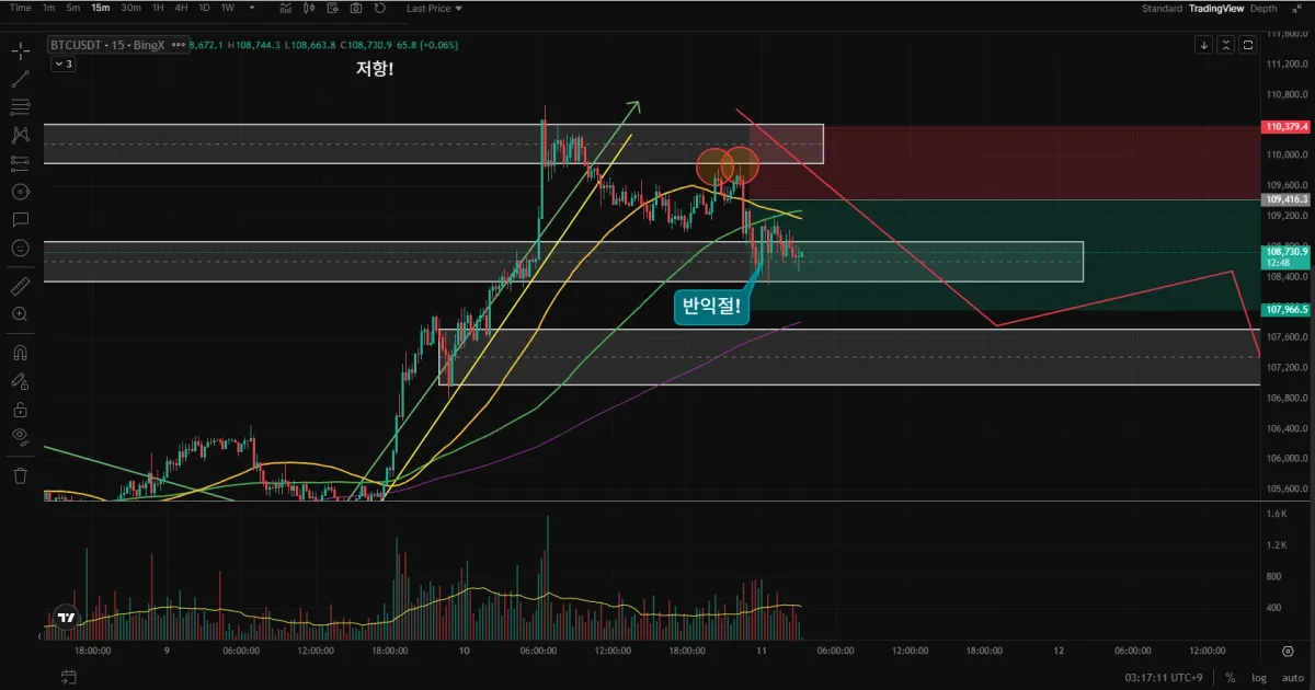 15분봉의 노란색 50선, 초록색 100선 아래로 캔들이 하방이탈.