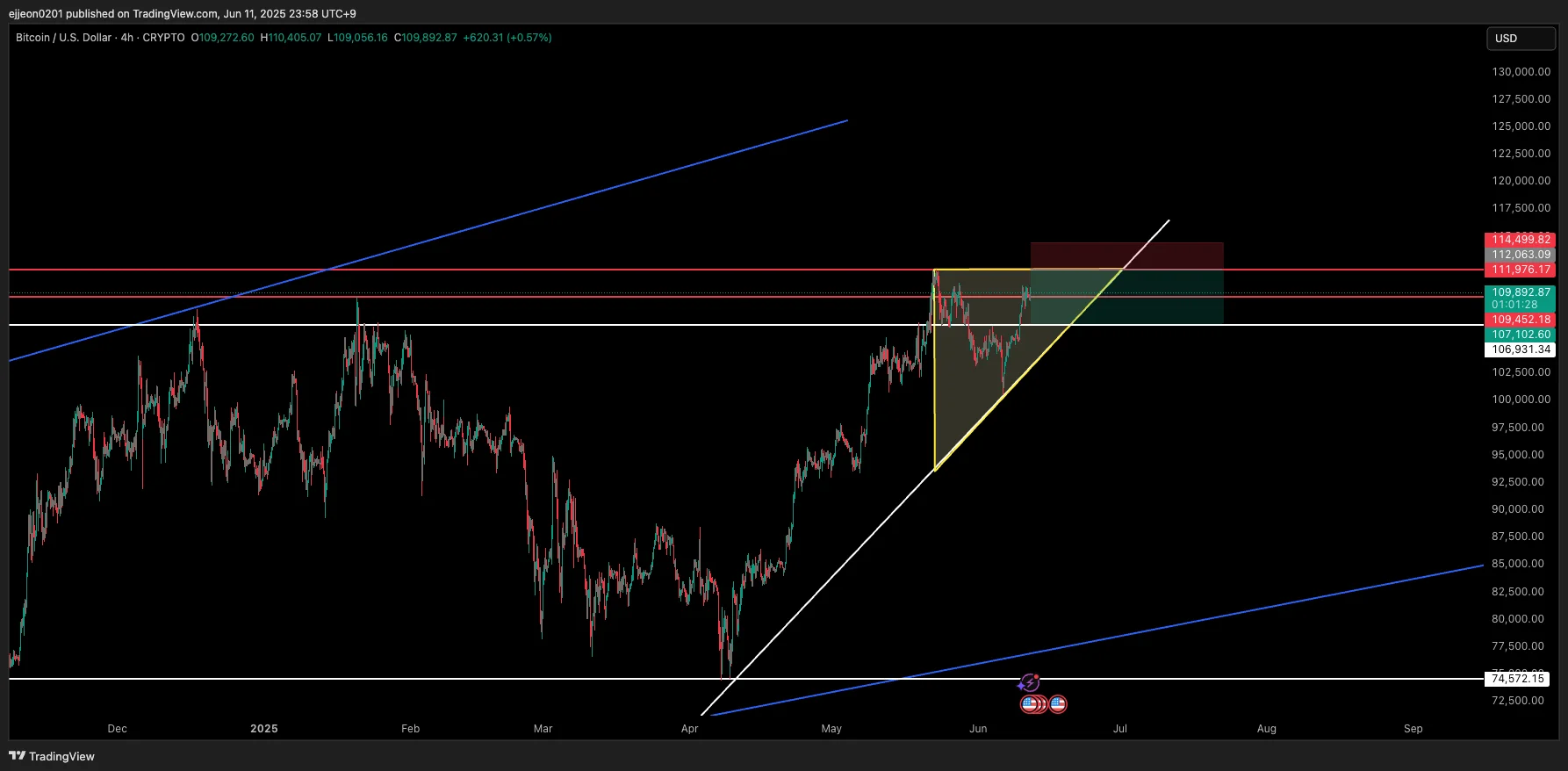 삼각형 안에서 움직이다 단기 저항인 111k를 뚫고 상승하거나 다시 맞고 내려와 106k까지 하락 가능성