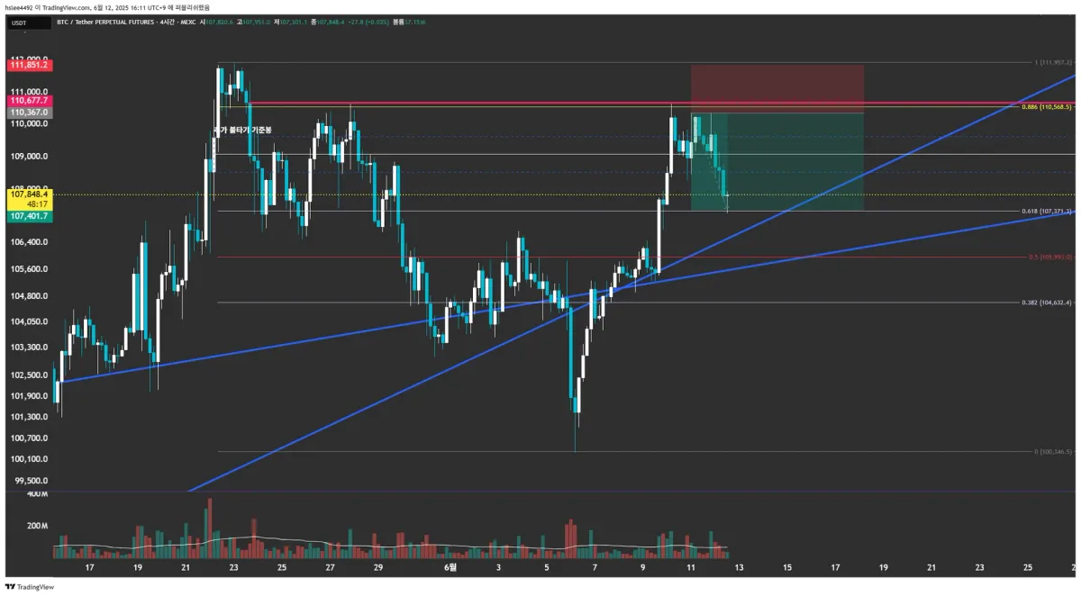 1시간 봉 기준 110700 고점 잡고 이후 하방 조정