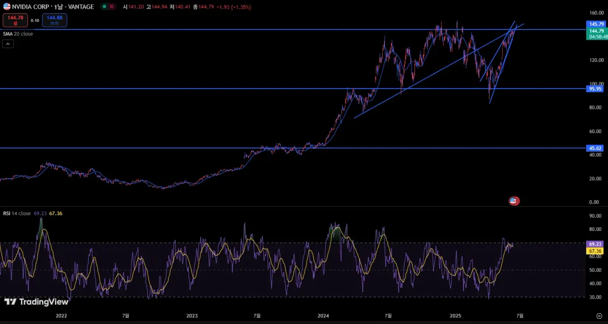 장기적인 추세에서도 하방으로 빠질 확률이 높고 단기적으로도 쐐기형으로 하방 압력이 강해지는 구간으로 보입니다.