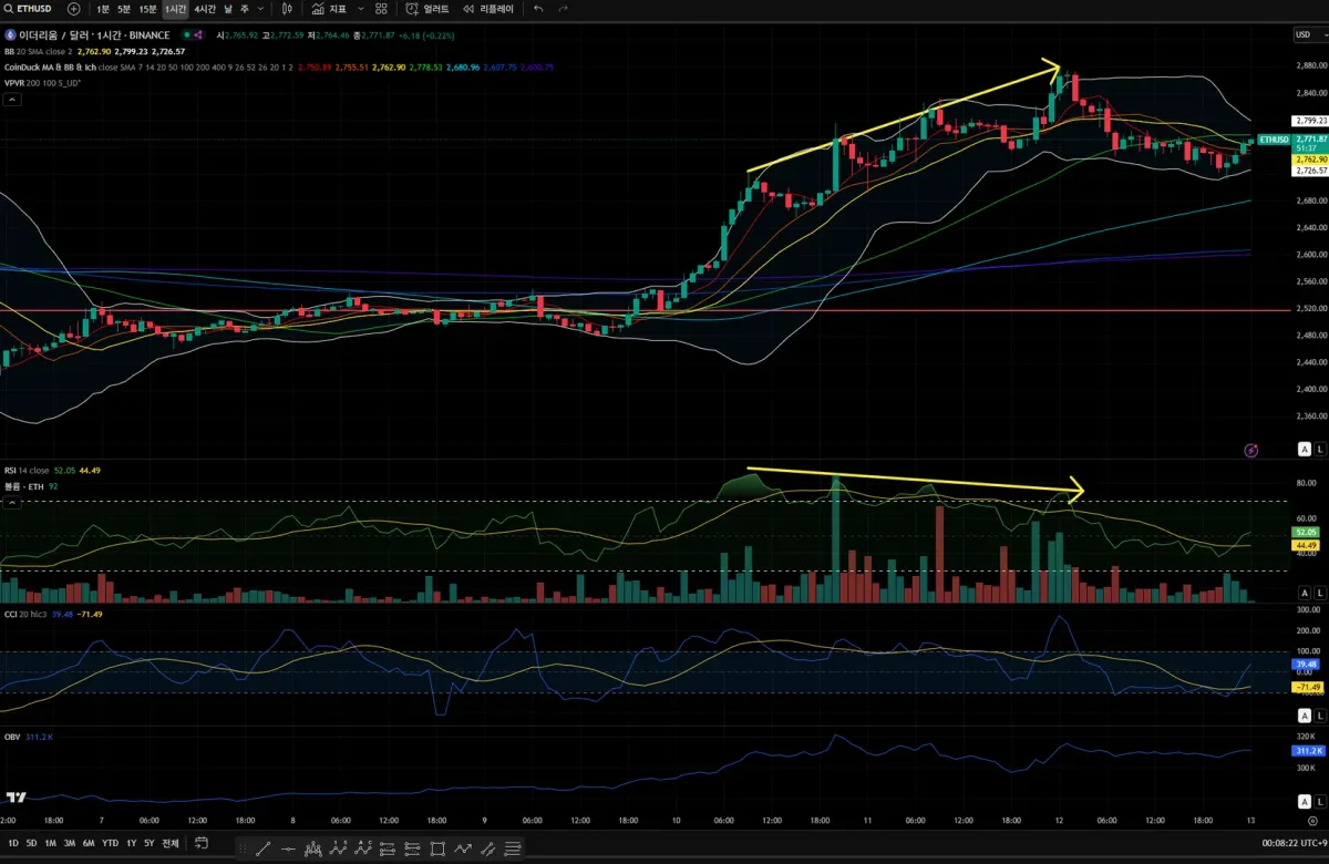 트레이딩뷰에 RSI지표를 설정해서 하락 다이버전스를 찾아봤습니다.