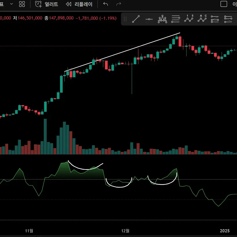 차트 상의 가격은 상승하고 있으나, 가격이 올라감에 따라 매수세가 줄어드는 모습에서 다이버전스를 확인할 수 있었습니다!