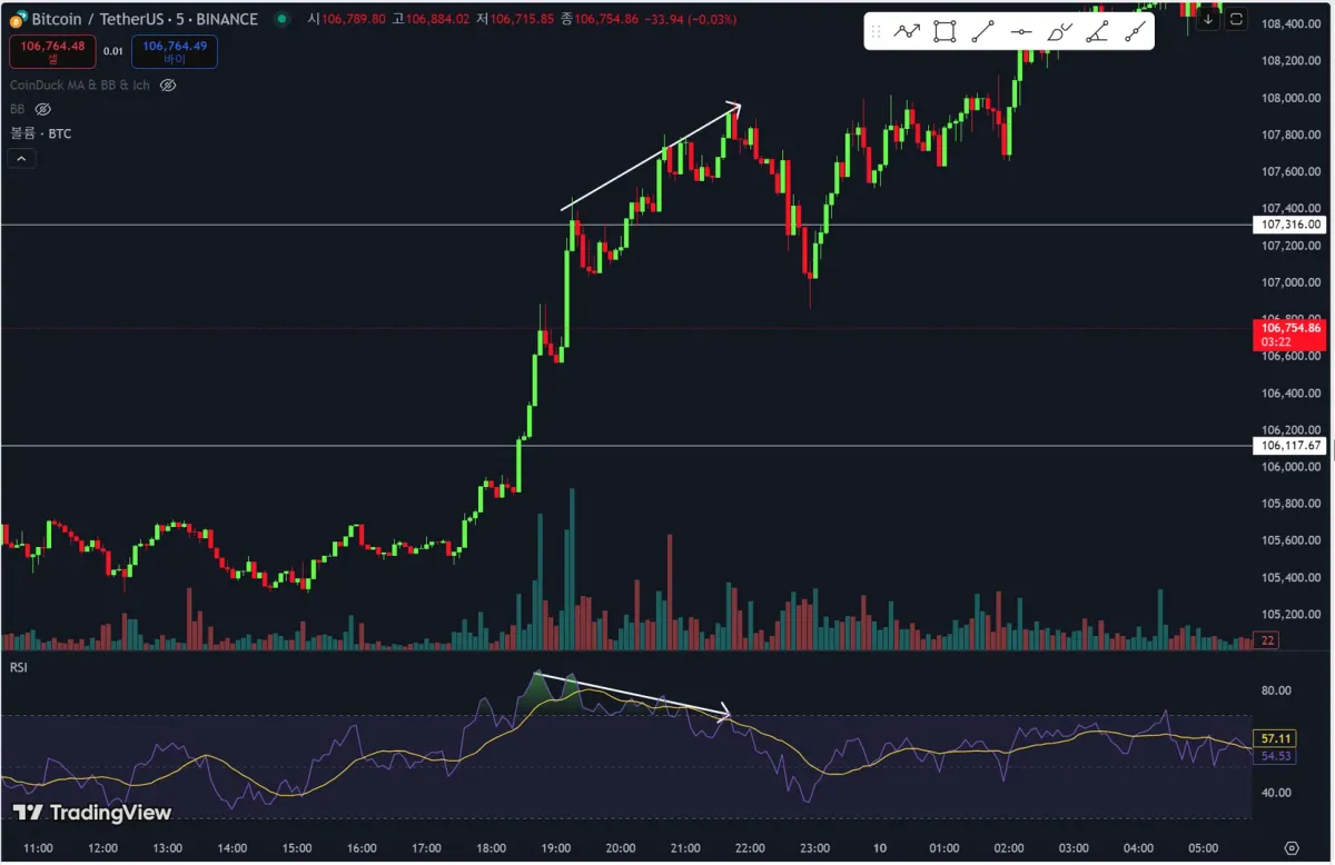Q. RSI 추가 후 RSI 다이버젼스 찾아봤고 5분 봉에서 발견했습니다.