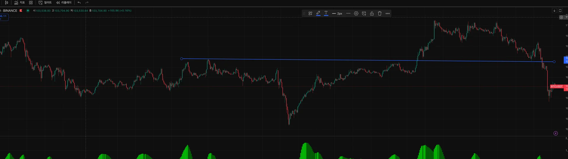 처음에는 저항선의 역할을 하다가 돌파한 후에는 한번 지지선의 역할을 한거 같아요