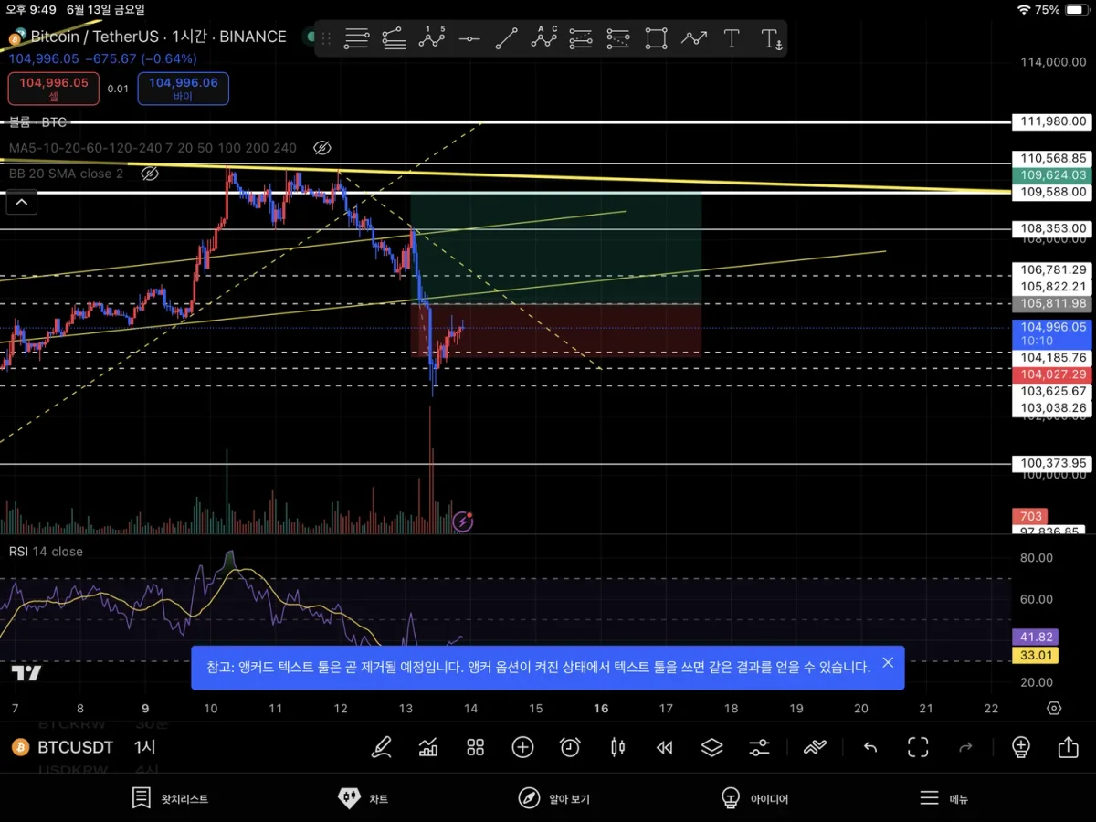 - 1시간봉에서 최우측 하방이 보이긴했지만 4시간 추세선 및 1시간봉 확인한 저항선에 닿고 오를거라 판단하고 (단기 조정이 왔으니 상승할거라 판단) 롱 체결