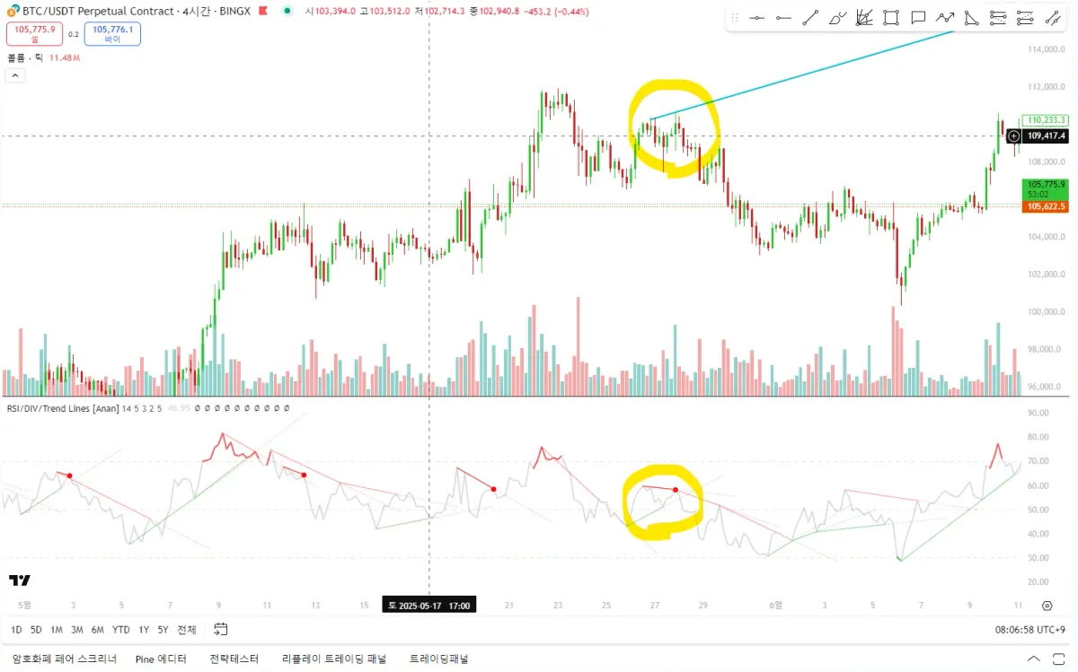 상승중에 하락 다이버전스 발생 후, 실제로 하락한 모습이 있었습니다.