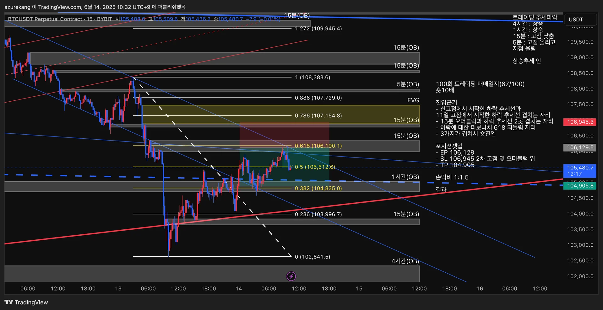 - 15분 오더블럭과 하락 추세선 2곳 겹치는 자리
