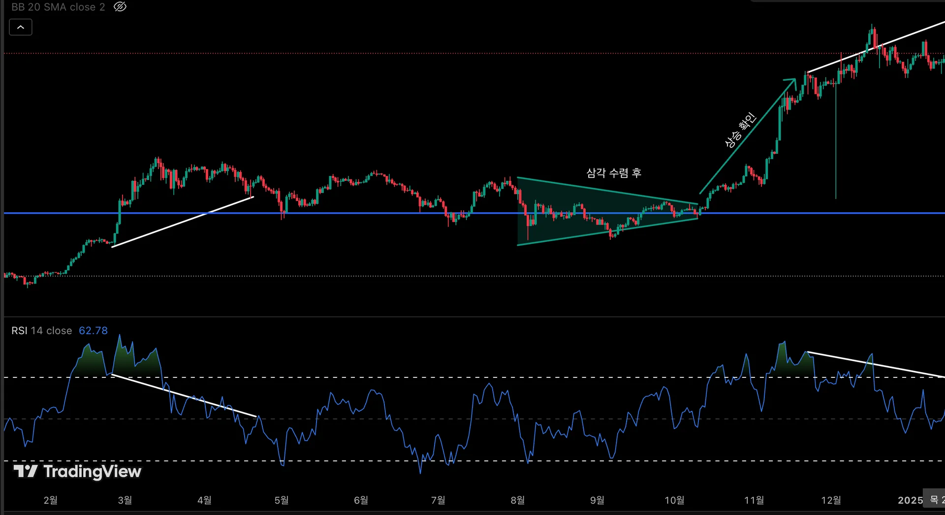최근 다이버전스와는 다르게 24년 2월에서 4월 사이 하락 다이버전스 확인하였으나 어느정도 지지를 받아 횡보 후 삼각 수렴이후 상승하는 발산 확인함