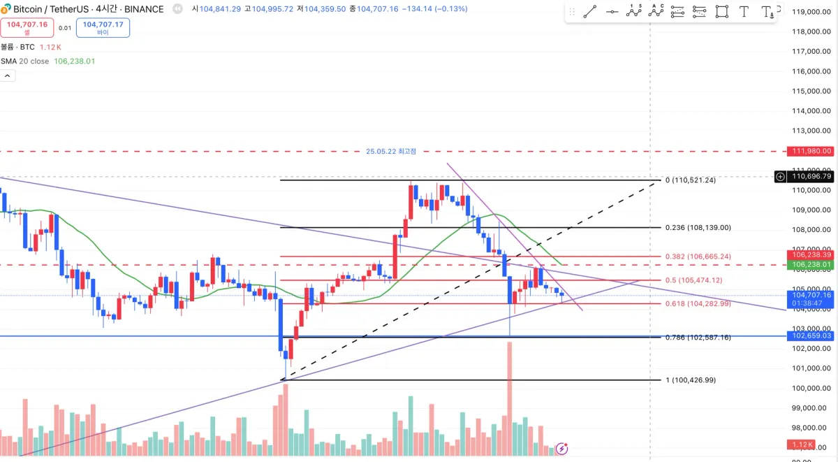 크게 유의미한 작도는 아닌것 같으나 제가 본 3각 수렴의 방향에서 당분간 횡보를 하지 않을까 생각이 드네요