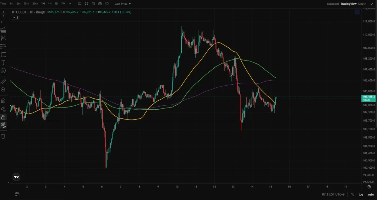 1시간의 비트코인 차트를 보면 내가 진입한 자리는 저기 초록색 원으로 표시된 부분..