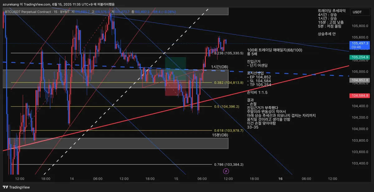 아래 상승 추세선과 피보나치 겹치는 자리까지