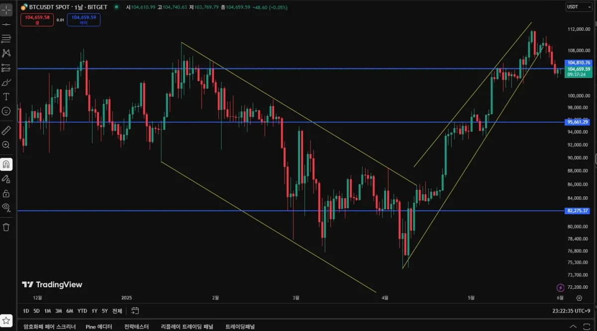 이번 강의를 통해 배운 내용을 바탕으로 BTCUSDT 차트(1일봉 기준)에 직접 작도해보았습니다.