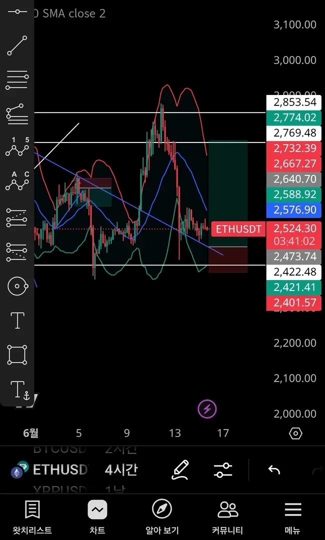 이더리움 4시간차트에서 아래쪽 파란색 추세선하단에 닿을경우 매수 포지션 진입대기중입니다.