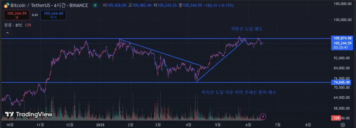 3번 저항과 지지로 작용한 74,045부근을 저항선으로 잡고 마찬가지로 3번 저항을 받은 109,874부근을 지지선으로 잡았습니다. 25.4.9일에 지지를 받고 상승한 후 하락 추세선을 돌파했을때 매수를 해서 저항선인 109,874부근에 도달했을때 매도를 했으면 좋았을 것 같습니다.